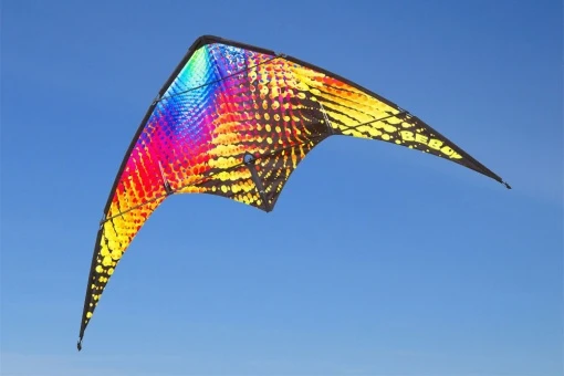 Der BEBOP ist ein sehr einfach zu fliegender Lenkdrachen für Piloten ab 8 Jahren. Sein komplett aus 4 mm Fiberglasrohr gefertigtes Gerüst verleiht ihm einerseits schon bei recht wenig Wind gute Flugeigenschaften, andererseits eine hohe Flexibilität und große Knautschzone bei Abstürzen. Das kräftige Segelmaterial trägt noch weiter zur Stabilität des Drachens bei. Durch seine – schon seit einiger Zeit beim Yukon bewährte – 4-Punkt-Gleitwaage ist der Drachen immer optimal eingestellt und das Gerüst wird auch bei kräftigem Wind optimal gestützt.