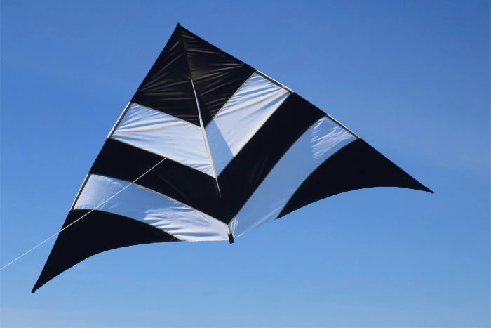 Elegant fliegt unser neuer schwarz weiß gestreifter Deltadrachen stabil am Himmel.