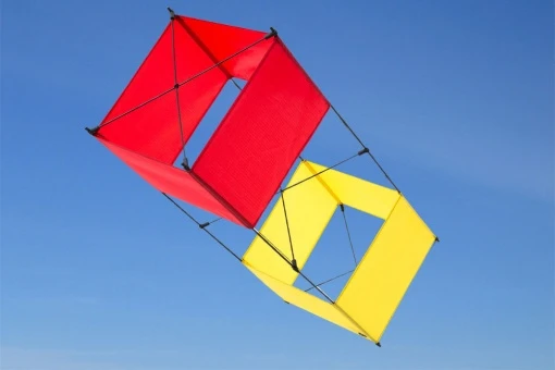 Dieser interessante Kastendrachen ist sehr vielseitig und erlaubt einen großen Windbereich. Die Flügel können bei Wind demontiert werden. Der Drachen ist immer etwas in Bewegung.
