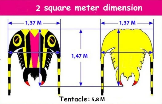- Kopf 1,37 x 1,47m, Tentakel 5,8m