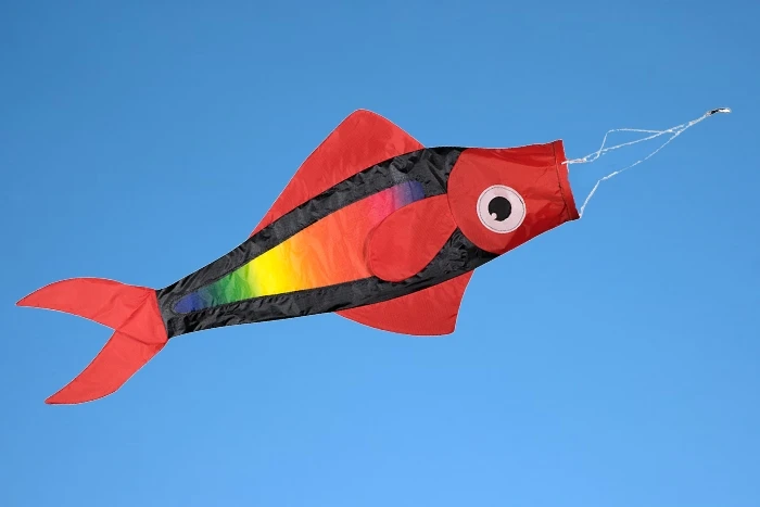 Der Fish Windsack Rainbow ist einem großen Karpfen nachempfunden. Er hat ein totes Gesicht und rote Schanz-und Rückenflossen.