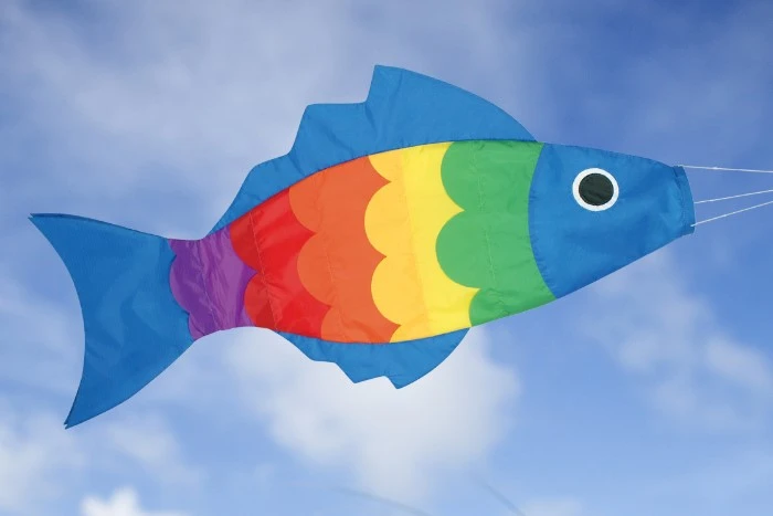 Der Fish Windsack wave ist einem großen Karpfen nachempfunden. Der, wie der Name schon sagt, ein blaues Gesicht und blaue Schanz-und Rückenflossen.